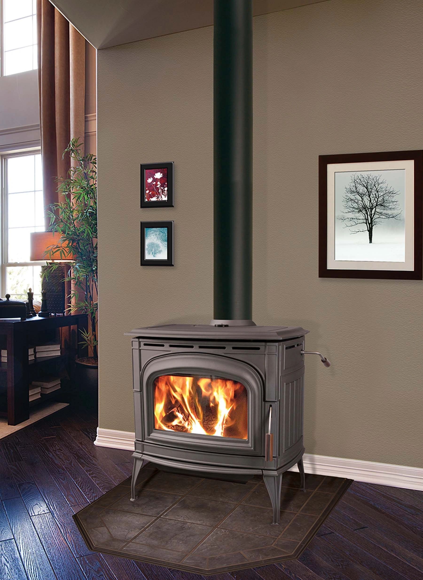 Le poêle à bois Blaze King Ashford 30.2 est un appareil de chauffage autonome en fonte, proposé en finitions peinture noire métallique, gris foncé ou émail châtaigne.