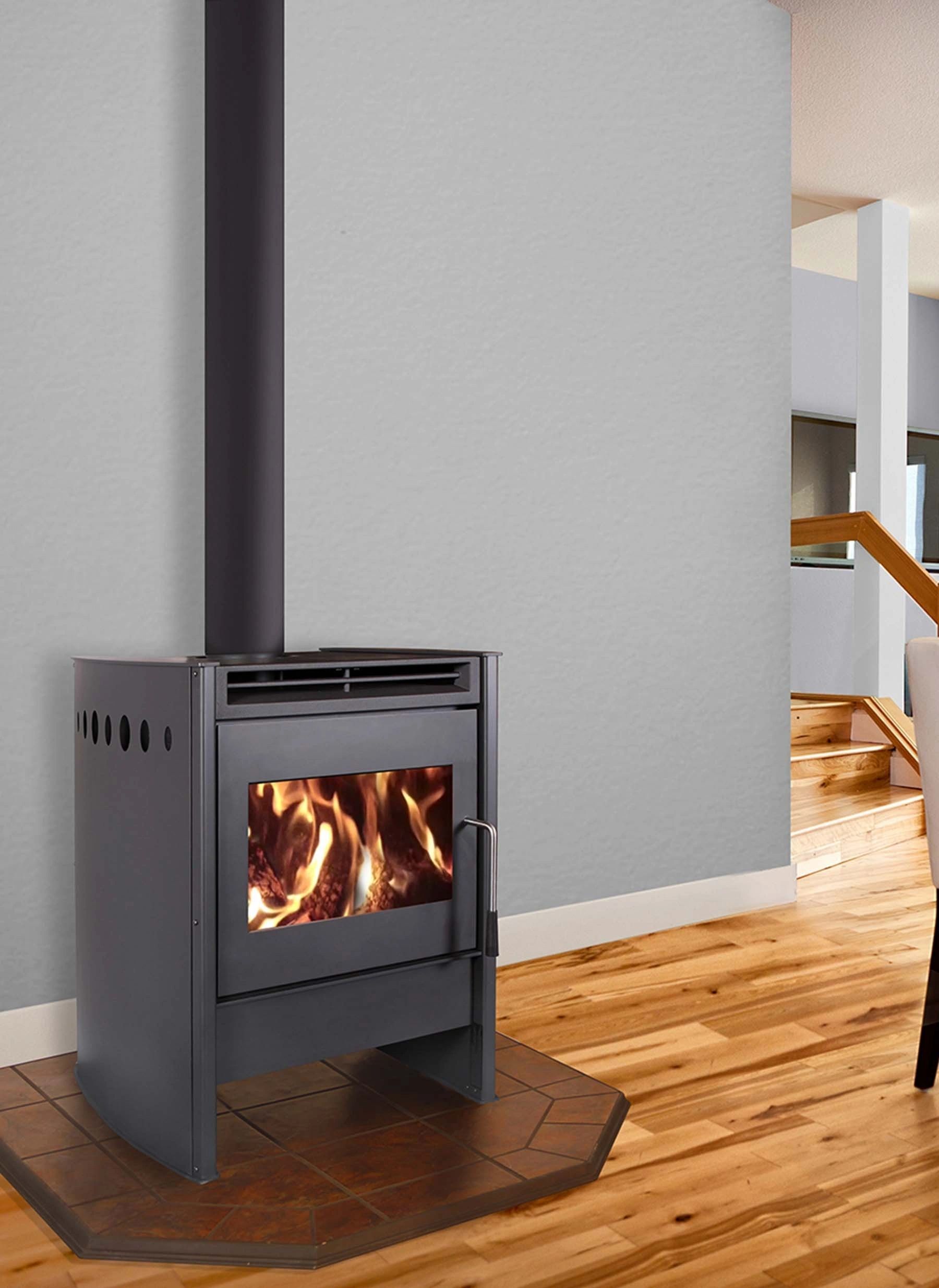 Le poêle à bois Blaze King Chinook 30.2 est un appareil de chauffage autonome au design européen moderne, doté de côtés incurvés et d’une grande porte vitrée offrant une vue dégagée sur le feu.