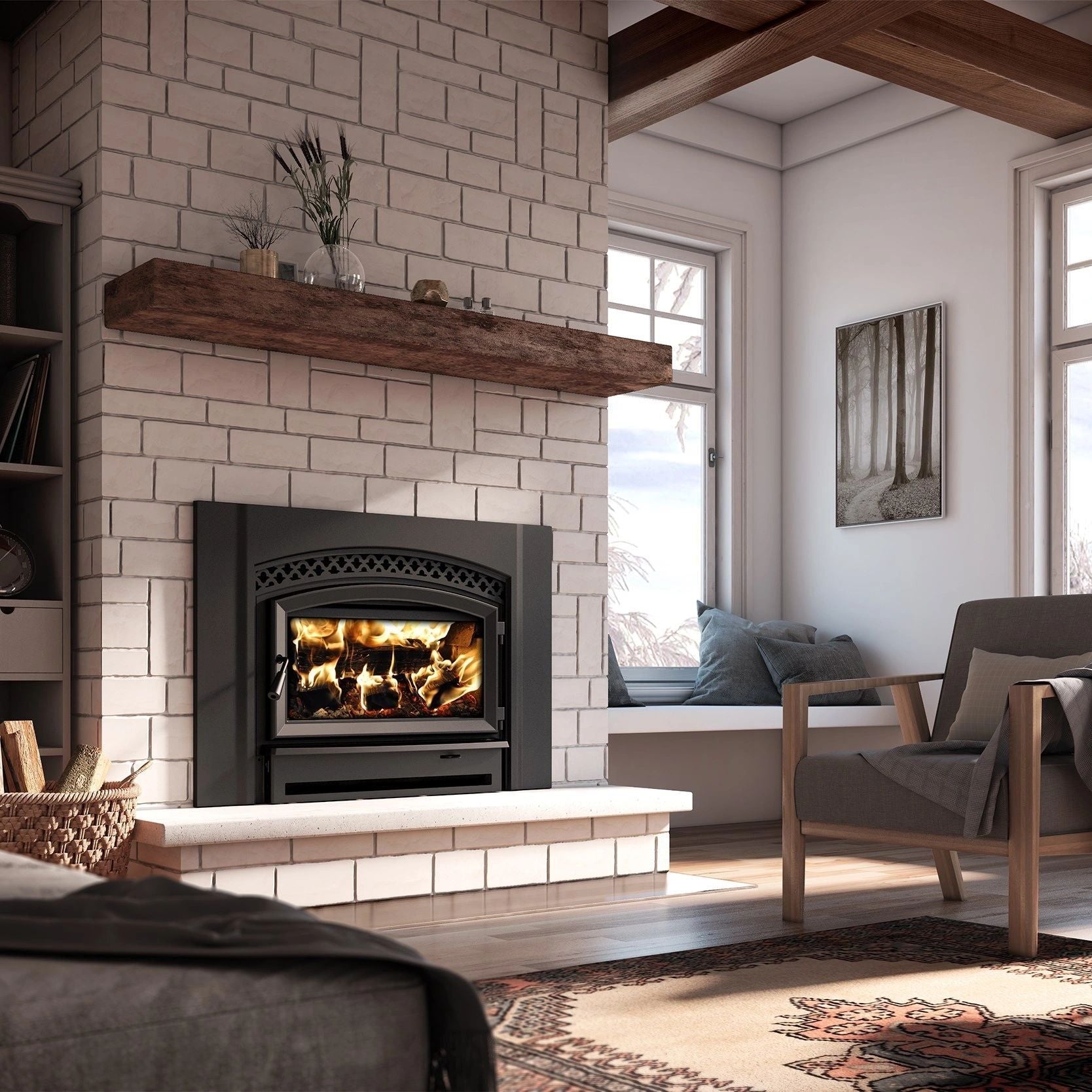 Prévu pour une installation avec un conduit de fumée de 6 pouces (sortie par le dessus). Idéal pour les espaces résidentiels, il combine performance thermique et esthétique soignée.