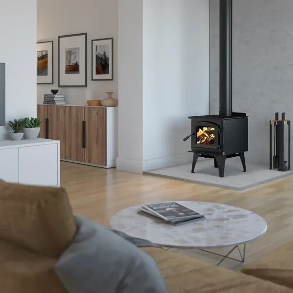 La porte arquée en fonte et les panneaux latéraux gravés apportent une finition soignée, tandis que les pieds en acier garantissent stabilité et durabilité. Ce poêle non catalytique présente un rendement optimal de 80 % et une émission moyenne de particules de 1,8 g/h, conforme aux normes EPA 2020.