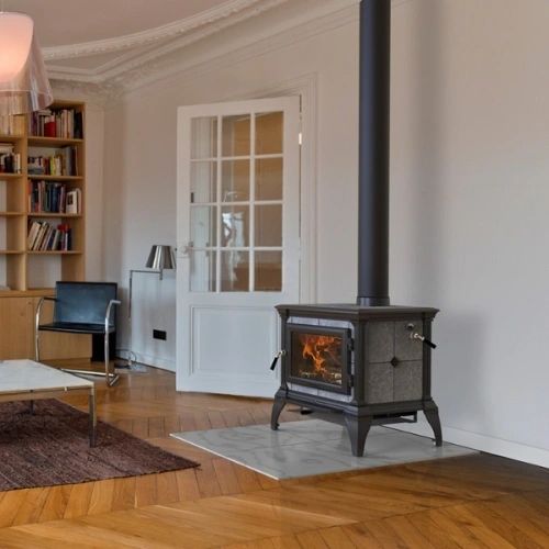 Disponible en émail brun, noir mat et émail vert d'eau, le Castleton est également éligible au crédit d'impôt fédéral sur les poêles à bois.