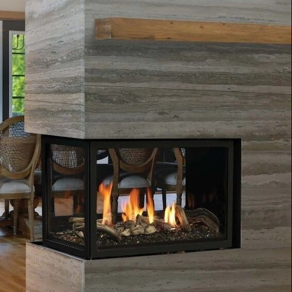 Marquis Atrium est un foyer gaz de type péninsule offrant une vue panoramique sur trois côtés, idéal pour séparer les espaces tout en apportant chaleur et élégance.