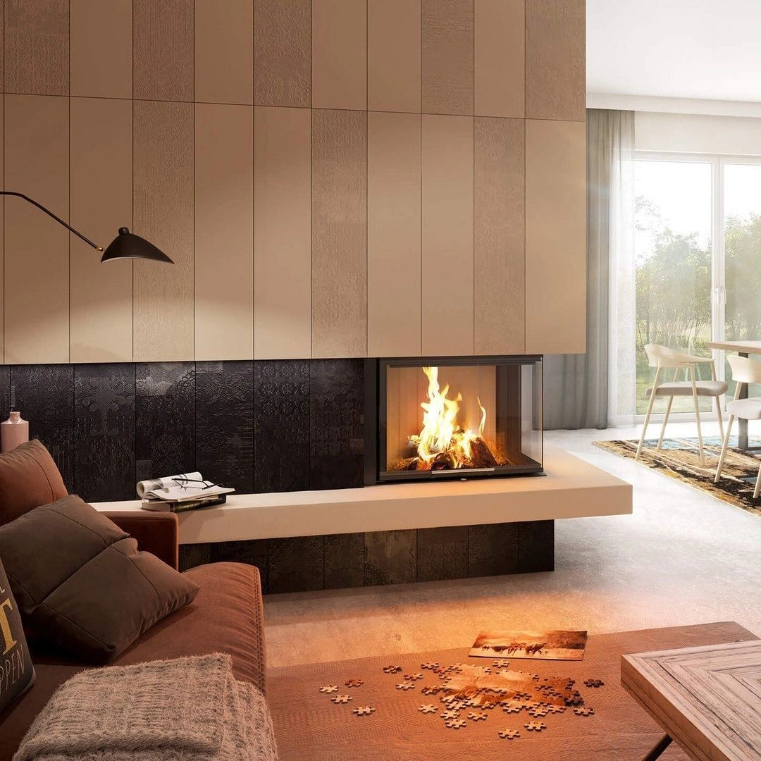 Spartherm Varia 2R-68h est un insert de cheminée moderne offrant une vue panoramique du feu grâce à sa porte vitrée en forme de L, qui s'ouvre vers le haut pour une utilisation aisée.